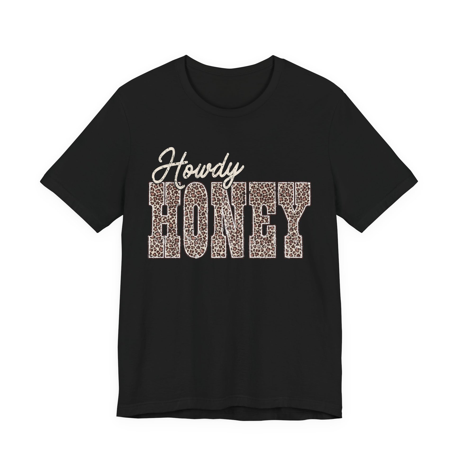 Soft, lived-in tee with a warm, playful attitude. The front reads “Howdy Honey” in layered script and bold block letters filled with a subtle leopard print—sweet and sassy at once. The lightweight 100% Airlume combed and ring-spun cotton drapes comfortably, breathes easily, and layers under jackets or wears solo on sunny days. Clean crew neck and retail fit keep the silhouette neat while side seams and shoulder tape maintain shape after washes. Comes with a tear-away label for itch-free wear and responsibly produced materials from a brand committed to ethical manufacturing. This shirt slips into everyday moments — porch chats, coffee runs, market strolls — adding a touch of country charm and confident flair.
